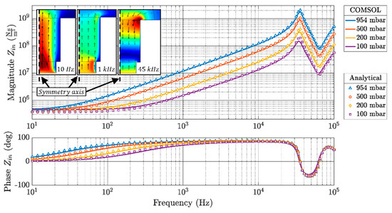 Comparison between the analytically computed acoustic input impedance 𝑍𝑖𝑛 for different air pressure values and the results obtained by finite element simulations in COMSOL. The insets show exemplary velocity profiles inside the channel for different actuation frequencies.