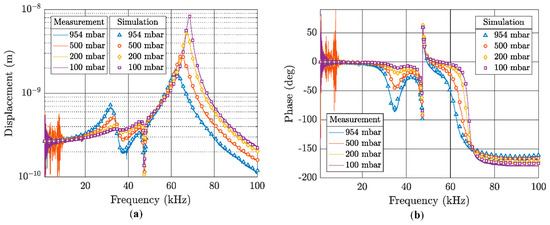 Comparison of the measured and the simulated frequency response of the displacement of the membrane for different ambient pressure values. These results refer to the full-system simulation of the electrically actuated transducer. (a) Magnitude of the displacement of the membrane; (b) Phase shift between the oscillating input voltage and the displacement of the membrane.