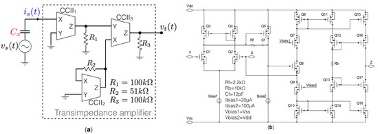 The block diagram of the CM-TIA is shown in Figure 1a while Figure 1b reports the schematic circuit of the proposed CCII designed at transistor level in AMS0.35 µm CMOS integrated technology with a power consumption lower than 900 µW at ±1 V dual supply voltage. Time and frequency domain simulation results of the integrated CM-TIA are reported in Figure 2. The current is(t) produced by the excitation sinusoidal signal vs(t) applied to the capacitance under test Cx is applied to the CCII1 low-impedance input X. The three resistors R1 = 100 kΩ, R2 = 51 kΩ and R3 = 100 kΩ set the total gain of the TIA: