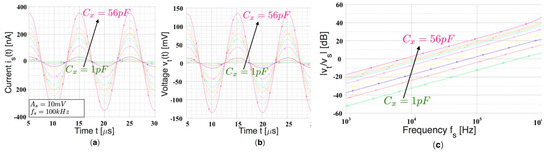 Time domain simulation results showing (a) the input signals is(t) and (b) vs(t) for different capacitance values Cx. The resulting transimpedance gain G is about 390 kΩ. (c) Frequency simulation.