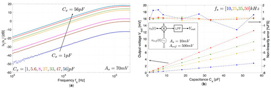 where k = 1.05 V is the multiplier gain factor. Figure 4b shows the measured output voltage Vout as a function of the reference capacitance Cx obtained at different frequency values fs of 10, 25, 35, 50 kHz. Experimental results are in good agreement with the expected values, showing a good linearity within the measurement range. The obtained maximum sensitivity is about 223 mV/nF for fs = 50 kHz with an estimated resolution calculated at 3 = 7.68 µV of about 34.5 fF.