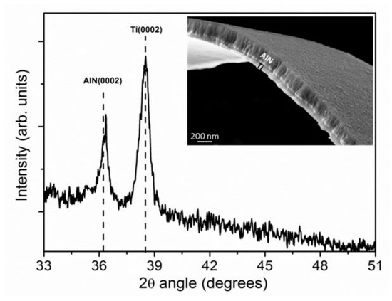 The Ti/AlN/Ti trilayer has been sputtered from high-purity (99.999%) Ti and Al targets. Ti layers have been deposited in Ar atmosphere at a pressure of 2.5 × 10−2 mbar while AlN in (Ar + N2) mixture at a pressure of 4.3 × 10−3 mbar with N2 flux percentage equal to 60%. The plasma was generated by applying an RF power of 150 W to both targets. All depositions have been performed at room temperature. Ti and AlN films thicknesses were fixed at 150 nm and 500 nm, respectively.