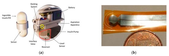 (a) Preliminary prototype of the implantable artificial pancreas; (b) image of the fabricated piezoelectric pressure sensor on kapton substrate.