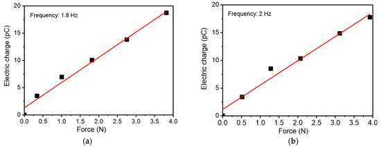 Electrical output of the piezoelectric pressure sensor as function of the applied force on the active area at different frequencies, (a) 1.8 Hz and (b) 2 Hz.