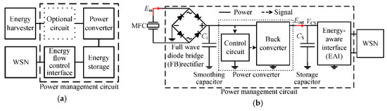 Common architecture of a PMC includes a power converter, an energy storage device and an interface to control energy flow from the energy storage device to the WSN as shown in Figure 1a. The EFCIs can be low-dropout (LDO) regulators [8], DC–DC converters [9] or any custom-designed circuitries [3,7,10] with two threshold voltages to turn-on and turn-off the WSNs, respectively. The threshold voltages are usually set based on the operating voltage range of the WSNs [3,4,7]. The power converters are usually set to maintain their output voltage at a fixed value and are used to charge up the energy storage capacitor towards the preset value [2,4,7]. It should be noted that power converters usually have low efficiency when their output power is low [11,12]. If the EFCIs have a turn-on threshold voltage VTH,on that is equal to the preset output voltage of the power converters, there will be a short period of time where the power converters are operating at lower efficiency. This is because the output voltage from the power converters is limited to not exceed their preset voltage. The EFCIs might have a slight delay in turning on the WSNs when the capacitor voltage has reached the VTH,on, which also limits the output power from the power converters. Hence, the VTH,on of an EFCI has to be lower than the maximum output voltage of the power converter.
