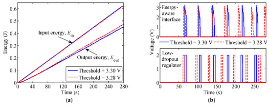 (a) Input and output energies of the power management circuit with threshold voltages of the energy flow control interface set to 3.30 V (solid) and 3.28 V (dashed) respectively; (b) Electrical load can be turned on more frequently by applying the proposed design rule on different energy flow control interfaces of energy-aware interface (top) and low-dropout regulator (bottom).