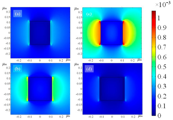 COMSOL Multiphysics® simulations have been carried out to define critical device parameters and estimate the influence of manufacturing tolerances. A waveguide width of 210 nm has shown the most optimized results providing agreement between optical confinement of the guided mode inside the core and a strong x-component of TE-mode at the interface between silicon and air (Figure 1b) [7]. In this case, a slight NWG width variation of ± 15 nm may result in a significant decrease of field intensity to almost zero for width sizes of 195 nm and 240 nm (Figure 1a,d) and 50% for 225 nm (Figure 1c). Moreover, optical forces were also calculated, which are divided into three main contributors (i.e., electrostrictive body force, boundary induced electrostriction, and radiation pressure). Calculation was done by exporting simulated TE-mode field components into MATLAB, determining force components in accordance to [8] and re-importing them to COMSOL. The simulations show that imperfection of only a few nanometers from the optimal NWG geometry will significantly influence the resonator performances. Therefore, a highly precise nanofabrication process has become a prerequisite to fulfill the device specification. Furthermore, optical and acoustical confinements of the associate waves have to be guaranteed by exposing the NWG from every side.