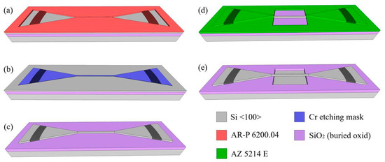 The high-precision nanofabrication process consists of five sequential manufacturing steps. At the beginning of device fabrication, a careful basic cleaning process was performed by boiling the sample at 80 °C in H2SO4 + H2O2 (1:1) and dipping it into HF acid to remove the natural oxide layer. To accomplish the necessary accuracy, electron-beam lithography tests were performed by a Zeiss SUPRA 35 FE-SEM with Raith ElphyPlus add-on using an acceleration voltage 30 kV and a minimum pixel size of 16 nm. Therefore, the SOI chip was coated with an 80 nm special e-beam lithography resist AR-P 6200.04 (Figure 2a) for lift-off process. An additional 30 nm protective coating of AR-PC 5090 defines a thin conductive layer on top of the e-beam resist, which avoids e-beam deflection caused by charging of the buried oxide (BOX) underneath the thin Si device layer (220 nm). By designing a 1000 × 1000 μm² dosage test matrix ranging from 55–110 μC/cm², optimal area dosages for the periodic gratings and the waveguide were identified to avoid proximity effects. After e-beam exposure, a thin chromium-etching mask film was deposited by e-beam evaporation, in which a subsequently lift-off process was performed by using AR 600-71 remover and ultrasonic bath (Figure 2b). An ICP-DRIE recipe using SF6/O2 plasma was chosen and optimized to obtain a highly controlled etching rate of 60 nm/min and orthogonal sidewalls (Figure 2c). To guarantee a homogenous thickness of grating coupler and nanowaveguide across the whole device, the etching process can be automatically stopped at the BOX layer. Afterwards, a photolithography step involving AZ 5215 E positive resist was used to expose the NWG surroundings for the subsequent wet chemical etching (Figure 2d). Finally, in the last step, the suspension of the NWG was obtained by removing the 3 μm BOX-layer underneath the NWG (Figure 2d) using hydrofluoric acid (HF) wet chemical etching step for 4 min, which leads to a total optical and acoustical isolation between the NWG and the substrate, leading to a wave confinement. The whole process sequence is shown in Figure 2.