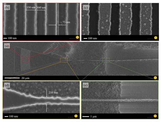 Nanofabrication process sequence on thin-film SOI wafer—device layer (220 nm), buried oxide (3 μm), handle layer (675 μm): (a) e-beam lithography using 80 nm AR-P 6200.04 (CSAR 62) resist; (b) chromium deposition via e-beam evaporation and subsequent lift-off process; (c) ICP-DRIE of device layer by SF6/O2 plasma; (d) combined photolithography using positive resist AZ 5214 E; (e) suspension of NWG by HF-based wet etching.