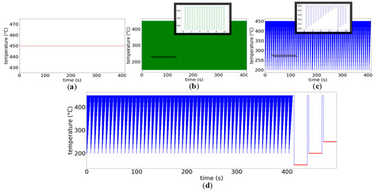 Gas sensor measurements were performed at the gas measurement setup at Materials Center Leoben (MCL), consisting of several mass flow controllers, a relative humidity sensor and a Keithley 3706A Switch. The setup ensures a controlled environment and a reliable resistance measurement of the discrete gas sensors. An additional in-house python software allows automatic measurements. The software operates the gas control and the switch according to the given experiment definition files and merges all the measurement data of an experiment into one hdf5 file. The experiment definition file specifies the test gases (e.g., CO) with the according concentrations, the relative humidity level, the heater temperature and the duration of each temperature step. The background gas for all the measurements is synthetic air (80% N2, 20% O2). Summarized, the measurement setup allows gas pulse measurements as well as TMO in an automated process. For this paper we used 2 different kinds of experiments for a CO sensor (AS-MLC, ams Sensors Germany GmbH). The temperature profiles can be seen in Figure 1 and the experiments were conducted as follows: Experiment 1 (Exp1): 3 different temperature profiles ((i) constant temperature (450 °C), (ii) two fast changing temperature steps from 450 °C (0.4 s) to 150 °C (0.2 s), (iii) several fast changing temperature steps from 450 °C (0.4 s) to 200–440 °C, resp., increasing always by 20 °C (0.2 s) and repeating it), lasting for total 410 s at 50% relative humidity in synthetic air were compared.