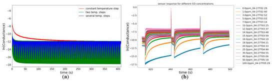 (a) Response curves (ln(G)) to different TMO modes—Exp1 (i)–(iii); (b) Response curves (ln(G)) to the three temperature jumps for different concentrations of CO—Exp2.