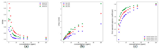 Features plotted versus various CO concentrations (a) Feature: ; (b) Feature: 1/τ; (c) Feature: first wavelet approximation coefficient.