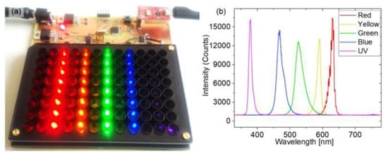 (a) PCB board with a fixed microtiter plate, all LEDs are placed well under the corresponding holes. (b) Spectra of LEDs in the 8th line, where the infrared spectrum is out of the measurement range.