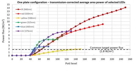 Transmission-corrected average area power of selected LEDs per color in dependence of the potentiometer level for the one plate configuration. Also plotted is the common target power flux of 1.8 W/m2 (dashed line).