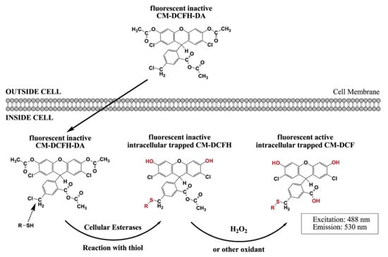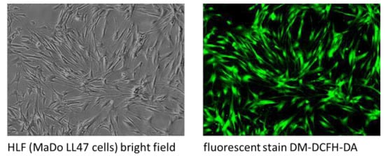 - Hempel, S.; Buettner, G.; O’Malley, Y.; Wessels, D.; Flaherty, D. Dihydrofluorescein diacetate is superior for detecting intracellular oxidants: comparison with 2′,7′-dichlorodihydrofluorescein diacetate, 5(and 6)-carboxy-2′,7′-dichlorodihydrofluorescein diacetate, and dihydrorhodamine 123. Free Radic. Biol. Med. 1999, 27, 146–159. [Google Scholar] [CrossRef]