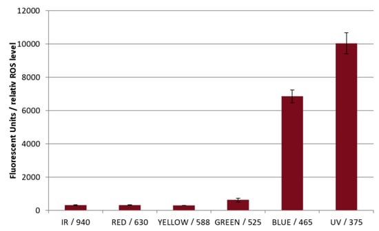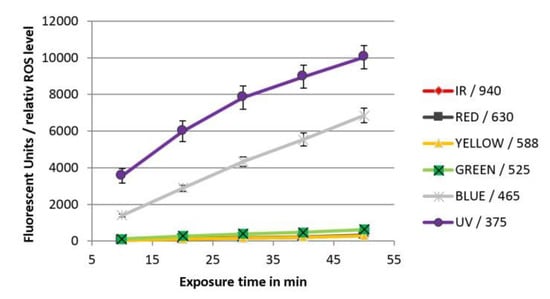 Generally, the production of cellular peroxides is known to lead to unwanted cell signaling side effects including apoptosis (programmed cell death). We used the cell permeable, peroxide activable, fluorescent dye (5,6-Chloromethyl-2′,7′-dichlorodihydrofluorescein diacetate, CM-DCFH-DA [] (see Figure 3)) to quantify the light induced peroxide formation. First experiments with MaDo LL47 standard human lung fibroblast showed that DM-DCFH-DA load was sufficient for in-vitro measurement of peroxide production after light exposure (see Figure 4). The cells were consecutively exposed for 10 min intervals with different wavelengths at 1.8 W/m2 and the fluorescent signal of the cells was measured on a fluorospectrometer (Figure 5). The environmental conditions during the light treatment were held on standard cell culture parameters. Biological replicates were performed in triplicates and fluorescent measurements were taken until a total exposure time of 50 min was reached (endpoint, Figure 6).