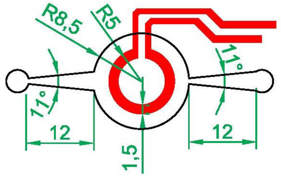 Schematic of the diffusor/nozzle pump. Black outline: Microfluidic channel, the depth of the channel is 250 µm; dimensions in mm. Red: Copper traces of the PCB.