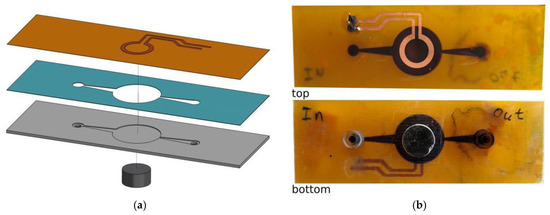 (a) Explosion drawing of the assembly. Orange: Flexible PCB. Blue: Double sided adhesive tape. Grey: Microfluidic polymer channel. Bottom: Permanent magnet. (b) Top and bottom view of the device. The microfluidic channel is filled with black ink for better visualization.