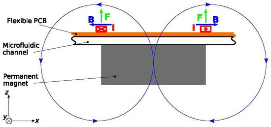 Principle of actuation. A cut-plane through the length dimension is depicted. Red: Copper traces with indicated current direction. Blue: Magnetic field lines and direction of the magnetic induction (B) at the position of the traces. Green: Forces acting on the traces, F = I(l × B).