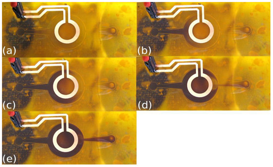 Pumping action over time. (a) 0 s, (b) 60 s, (c) 120 s, (d) 180 s, (e) 240 s after applying a sinusoidal actuation current (2 A/5 Hz) to the copper traces. The dark spot on the left represents the inlet reservoir (filled with black ink).
