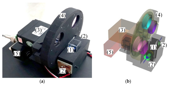 (a) 3D printed prototype of the measurement chamber with cuvette (1), LED’s (2), servo (3) for rotating the optical filter wheel (4) and the photomultiplier (5). (b) CAD view of the measurement chamber.