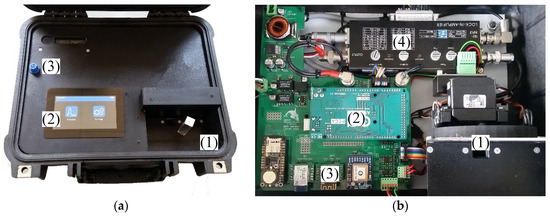 (a) Hardware of the sensor prototype with measurement chamber (1), processor board (2), wireless modules (GPS, WIFI, BT) (3) and the lock-in amplifier (4). (b) Sensor system ready to use with measurement chamber (1), Touch Display (2) and external power connector (3).