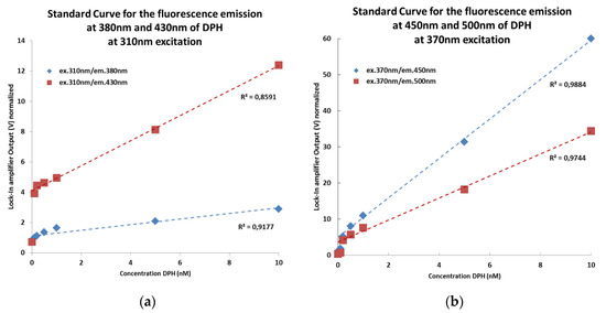 (a) Standard Curve of the sensor system with DPH in cyclohexane for the fluorescence emission at 380 nm and 430 nm at 310 nm excitation (BIX analysis). (b) Standard Curve of the sensor system with DPH solved in cyclohexane for the fluorescence emission at 450 nm and 500 nm at 370 nm excitation (FIX analysis).