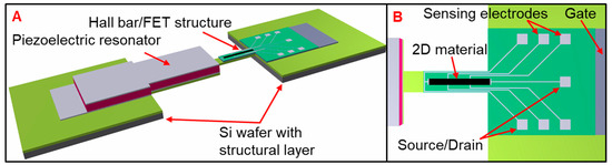 Proof of concept and principle of proposed structure (not to scale): (A) MEMS piezoelectric resonator mechanically linked to stretching Hall bar/FET structure; (B) The detail of stretching part with 2D material using Hall Bar/FET structure for electric measurements of 2D material properties.