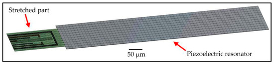 The meshed model of single clamped piezoelectric resonator linked mechanically to single clamped stretching device representing 2D material Hall Bar/FET structure.