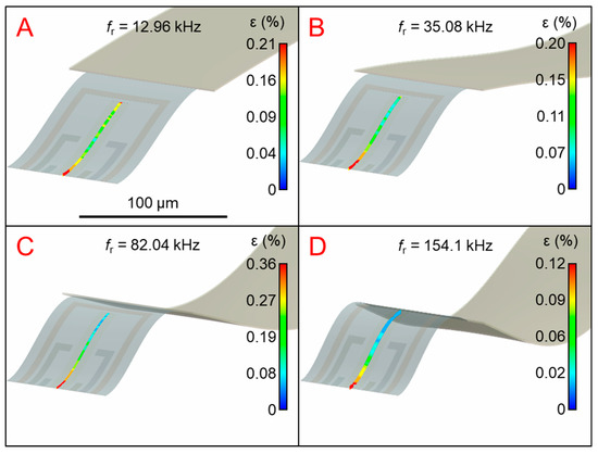 FEM structural analysis (Figure 3) shows the influence of resonator bending on induced strain (ε) into the stretched part which is linked mechanically to the resonator part. The size of resonator part was 600 μm × 100 μm and the size of stretched part was 100 μm × 75 μm. The harmonic analysis was performed in range from 0 to 200 kHz and four resonant modes (Figure 3) were found. The 3rd and 6th resonance modes from the modal analysis did not show any response due to different bending mode (torsional).