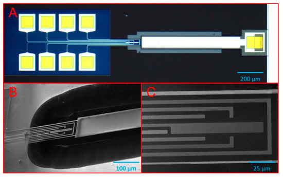 Fabricated structure for 2D material characterization: (A) An optical image of entire structure; (B) scanning electron microscope analysis of released resonator; (C) the detail of stretched part with electrodes.