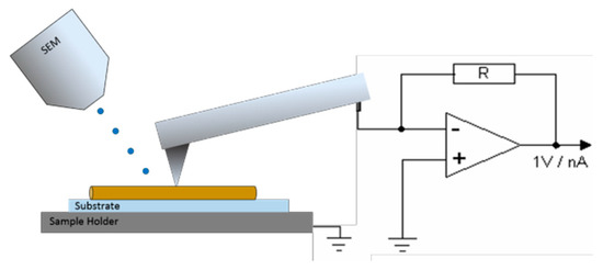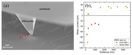 For EBIC characterization, we place the SPM-probe on one end of a SnO2, respectively CuO NW. While the SPM-probe stays fixed, the electron beam focus point is varied along the NW and the current induced by the electron beam is measured via the SPM-probe (see Figure 3). For the SnO2 NW, a quite stable positive current of about 30 pA is observed for beam-probe distances larger than 500 nm up to the end of the NW. For the CuO NW, negative current is measured, which decreases from about −30 pA at larger (>500 nm) beam-probe distances, to down to −70 pA at small beam-probe distances. The same current decrease for beam-probe distances <500 nm is also observed for the SnO2 NW, with values down to −100 pA at 200 nm beam-probe distance. No beam-probe distances larger than 1.5 µm are measured for the CuO NW due to the smaller length of the NW.