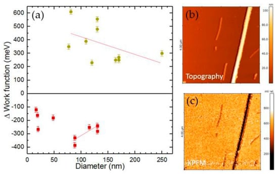 (a) Difference in WF between SnO2 NWs and the Cr substrate (dark yellow circles), and CuO NWs and Cr (red squares). Red lines are linear fits to the data points; (b) Topography and (c) KPFM image (4 × 4 µm2) of a representative CuO NW.