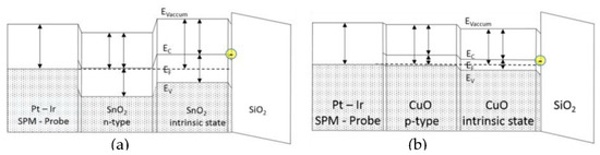 Band structure of the SPM-probe placed on (a) SnO2 NW and (b) CuO NW on SiO2 substrate, with EC the conduction band, EV the valence band, and EF the Fermi level.