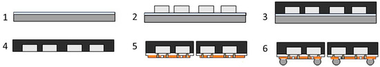 FOWLP is a rapidly growing high-density packaging technology, which has many advantages such as short interconnection, low thermal resistance, high RF performance, and small package outline dimension. A lot of activities are running worldwide dealing with FOWLP. It can be used for multi-chip packages for System in Package (SiP) and heterogeneous integration. However, there are still several technical challenges facing FOWLP that need to be overcome, such as the die shifting issue, warpage due to the material coefficient of thermal expansion (CTE) mismatch and the fabrication cost and complexity of the redistribution layers (RDL). For FOWLP two basic process flows are encountered: the “mold-first” or the “RDL first” approach [1,2,3]. The mold-first process flow is depicted in Figure 1, beginning with the placement of known-good-dies onto a temporary carrier with thermal release tape laminated on top. After overmolding and subsequent release of the temporary adhesive tape, the redistribution layers (RDL) are fabricated (step 5). RDLs are typically metal interconnection schemes or metal traces that route the electrical signals from one part of the package to another. This is usually achieved by combining photolithographic processes, as well as sputtering and plating. In the case of a high-density FOWLP, multiple layers of RDL are required to support the necessary routing. The metal traces together with dielectric isolation layers generate multi-layer RDLs.