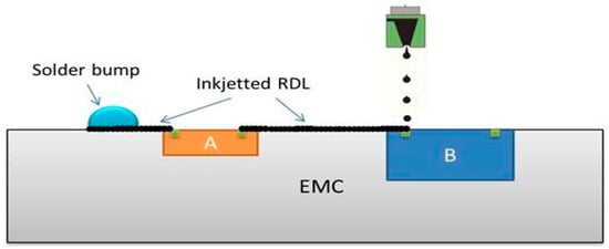 Schematic demonstration of inkjet-printed RDLs for a SiP FOWLP.