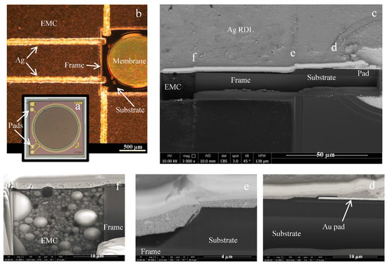 An example for inkjet-printed RDLs in FOWLP; a microphone chip with 4 pads before molding. (a) and a molded one with Ag RDLs (b); the corresponding FIB-cut cross-sectional view (c) and the three critical interfaces between pad-substrate (d), substrate-frame (e) and frame-mold (f).