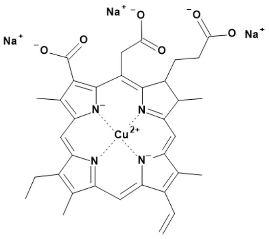 For all experiments, E141 (ii) was used as color dye. It was provided by ExtraChem GmbH (Huchzermeierstr. 8a, 33611 Bielefeld, Germany), and consists of copper chlorophyllin (3.5–4.3%), maltodextrin, polysorbate 80 and potassium hydroxide. The sodium copper chlorophyllin is derived from a standardized and purified extract of grass or edible plant material. It is vegetarian, vegan, kosher and halal [4]. The chemical structure of sodium copper chlorophyllin is shown in Figure 1.