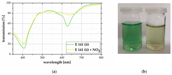To demonstrate the gas dependent color change of E141 (ii), 45 ppm NO2 were passed through the solution. The reaction leads to a hypsochromic color change from bright green to pale yellow within 60 minu as shown in Figure 2b. The related transmission spectra are given in Figure 2a. The reaction causes transmission changes in the violet (λ = 410 nm) and orange (λ = 630 nm) wavelength area.