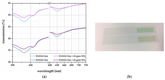 (a) Transmission spectra of screen printed E141 (ii) on PE-foil with different layer thicknesses (2nn and 3nn). The samples were exposed to 45 ppm NO2 in N2. (b) Picture of the test stripes on PE-foil before (up) and after (down) the exposure to 45 ppm NO2.
