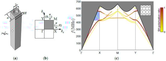 The guiding layer of Love waves is a H = 2.4 µm height of silica (ρ = 2200 kg/m3, E = 70 GPa, v = 0.17) covering a 90ST-cut quartz substrate (Euler angles = (0°, 47.25°, 90°), LH 1978 IEEE), which has been rotated 90 degrees around the z-axis from the ST-cut quartz, for a fast SH wave (5000 m/s) can be generated. The shear wave velocity in the silica film is 3438 m/s, less than that in 90ST-cut quartz substrate, indicating the existence of Love waves. The cylindrical holes in the silica film have a radius of r = 0.8 µm. The period of square array or the lattice constant is a = 4 µm. The air hole is chosen because of its strong contrast in density and elastic constants with regard to the silica. A unit cell of the PnC constructed in COMSOL, showing in Figure 1a, is employed to calculate the dispersion curves or the band structure. Floquet periodic boundary conditions are applied along the x and y directions. The Love waves propagate along the x-axis (y-axis of ST-cut quartz) where the electromechanical coupling of Rayleigh type SAW to the generated electric field is zero [6]. The first Brillouin zone (BZ) of the PnC is shown in Figure 1b, the irreducible BZ is a square bounded by Γ-X-M-Y-Γ. The surface of PnC coincides with the plane z = 0. The wavelength normalized energy depth (NED) is calculated to select the surface modes for which is less than 1.