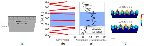 The resonator is realized by removing one lines of holes along the y direction in the lattice of PnC, forming a cavity perpendicular to the propagating direction. A supercell is constructed and shown in Figure 2a, with 𝑊 the width of the cavity. Periodic boundary condition is applied along y direction. The band structure of Love waves in the defect-containing PnC is calculated along Γ-X.