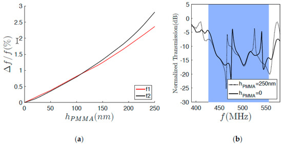 PMMA film is then added on the cavity. Figure 3a shows the sensitivity of the resonator calculated for different PMMA thickness hPMMA. 𝑓 is the resonant frequency of the cavity modes without the PMMA film, while Δ𝑓 is the difference between the resonant frequencies with and without the polymer. Transmission spectra of the resonator with and without the PMMA film shown in Figure 3b exhibit shifts for the two peaks, showing the possibility of displacing the resonant frequencies of cavity modes by modifying the thickness of the polymer.
