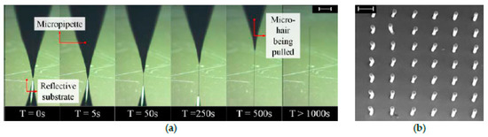 Time lapse sequence showing fabrication process of micro-hairs (scale bar −150µm); (b) SEM image of a representative micro-hair array at 10° stage tilt (scale bar −20µm).