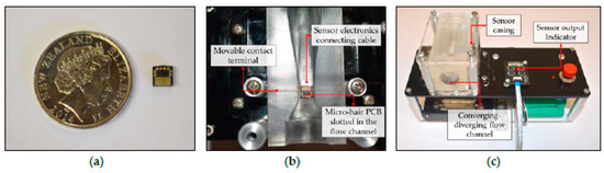 The replacement of sensing element demands manual handling of the sensing element PCB while its placement in the recess and the micro-hair’s dimension of φ5.5 ± 0.5 × 1 mm only allow sensing of low-velocity flows (0.66–0.97 m/s). A gradually converging and diverging flow channel amplifies the air-flow velocity enabling measurement of ultra-low velocity air flows with stiffer micro-hairs. The two halves of the soft flow channel ensures leakless flow through the channel retaining the flow regime and the inlet and the outlet pressure. The channel is fastened down within a Perspex enclosure mounted above a stationary platform. This platform also houses a precision micrometric stage which holds the contact terminal in place suspended above the sensing element PCB. The movement of this stage moves the contact terminal allowing replacement of the sensing element PCB without damaging the micro-hairs during the assembly process (Figure 3a).