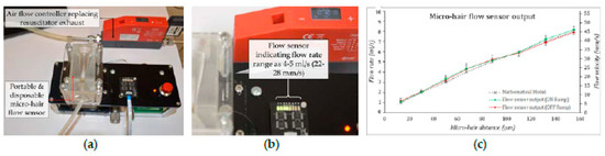 The flow sensor’s performance is validated by connecting the device to a Vögtlin mass flow controller. The controller is connected to precisely allow a specific flow rate analogous to the automated resuscitator as shown in Figure 3a. The outlet flow from this controller is connected to the micro-hair flow sensor’s inlet. The flow is ramped up and down across the entire flow range and the flow rates at which each micro-hair makes contact with the contact terminal is recorded at the instant individual LEDs turn on (Figure 3b). Figure 3c shows the sensor’s response to the air flow.