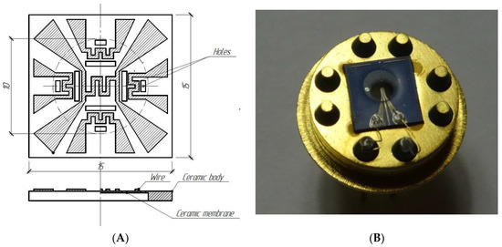 The analysis of this sensor design showed that its insufficient reliability. Final sensor design is presented in Figure 2B. The sensor is a ceramic chip, consisting of rigid ceramic frame with hole covered with 10–30 mm thick ceramic membrane. All elements of this chip are made of LTCC ceramics to avoid the problems with difference in thermal expansion coefficients. Microheater is made on the top of the membrane by aerosol jet printing of Pt ink. Power consumption of the microheater at working temperature used in thermoconductometric regime (150 °C) is of ~20 mW.