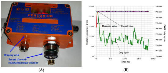 (A) Smart sensor unit used for the stabilization of temperature of microheater, measurement of power supplied to the microheater at this stabilized temperature, and for the connection with read-out instrument. (B) Heating process of ceramic MEMS gas sensor. Pre-set resistance corresponds to working temperature of 350 °C. 100% duty cycle of PWM corresponds to 8000 value at the right axis. τ90 of the heating process is of ~8 ms.