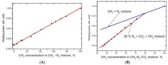 The results of the measurement of gas composition of the mixture of CH4 with N2 and CO2 are presented in Figure 4A,B, respectively. Thermal conductivity of N2 and CO2 are lower than thermal conductivity of methane (Figure 1) Therefore, power necessary to maintain the same temperature in nitrogen is lower than those in methane approximately by 20% in correspondence with data of Figure 1