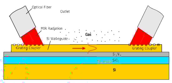 - Ranacher, C.; Consani, C.; Hedenig, U.; Grille, T.; Lavchiev, V.; Jakoby, B. A photonic silicon waveguide gas sensor using evanescent-wave absorption. In Proceedings of the 2016 IEEE SENSORS, Orlando, FL, USA, 30 October–3 November 2016; IEEE: Orlando, FL, USA, 2016; pp. 1–3. [Google Scholar]